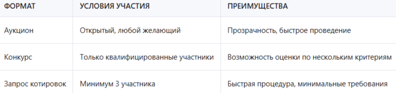 Сравнение форматов торгов: аукцион, конкурс, запрос котировок