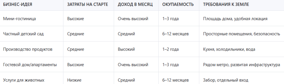 Чтобы помочь вам принять обоснованное решение, подготовили таблицу сравнения основных характеристик бизнес-идей на участке ИЖС: