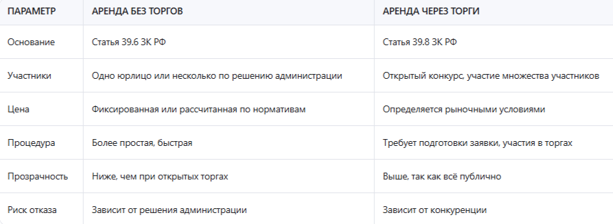 Эта таблица демонстрирует, что аренда без торгов может быть более выгодной, особенно если у вас уже есть чёткий план реализации проекта и вы хотите минимизировать бюрократические барьеры.