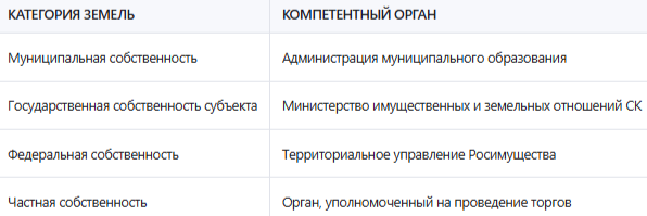 Выбор органа, в который необходимо обратиться для выставления земельного участка на торги, зависит от категории земель и формы собственности: