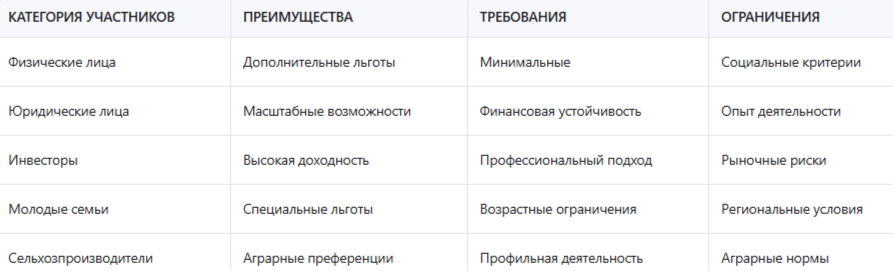 Юридические лица и корпорации имеют доступ к более масштабным возможностям программы, но с повышенными требованиями к финансовой устойчивости и опыту деятельности. Для них программа открывает возможности для крупных инвестиций в земельные ресурсы и реализации масштабных проектов. Однако такие участники должны соответствовать строгим критериям отбора и иметь опыт в соответствующей сфере деятельности.