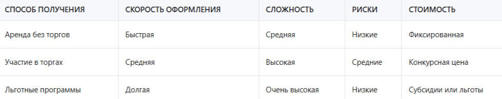 Эта таблица поможет понять, какой способ получения земли больше соответствует вашим финансовым возможностям и целям. Например, если вы хотите быстро начать бизнес, лучше рассмотреть аренду без торгов. Если же готовы к длительной процедуре ради снижения затрат — льготные программы станут отличным выбором.