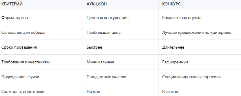 Таблица: сравнение аукциона и конкурса при покупке участка